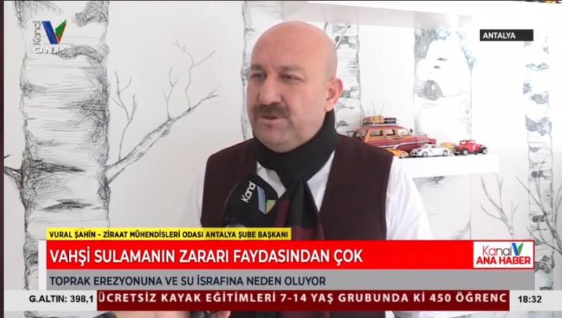 Şube Başkanımız Vural Şahin, 18 Şubat 2021 tarihinde Kanal V Ana Haber programında kuraklık ile ilgili açıklamalarda bulundu. Yanlış sulamanın kuraklığı tetiklediğini dile getiren Şahin, üreticilerimizin vahşi sulamayı bırakıp, kapalı sulama sistemlerine geçmelerini önerdi.