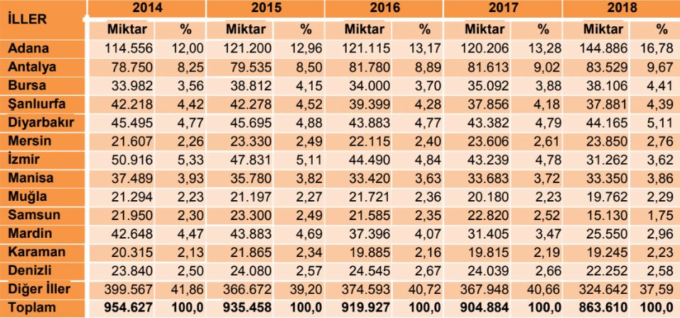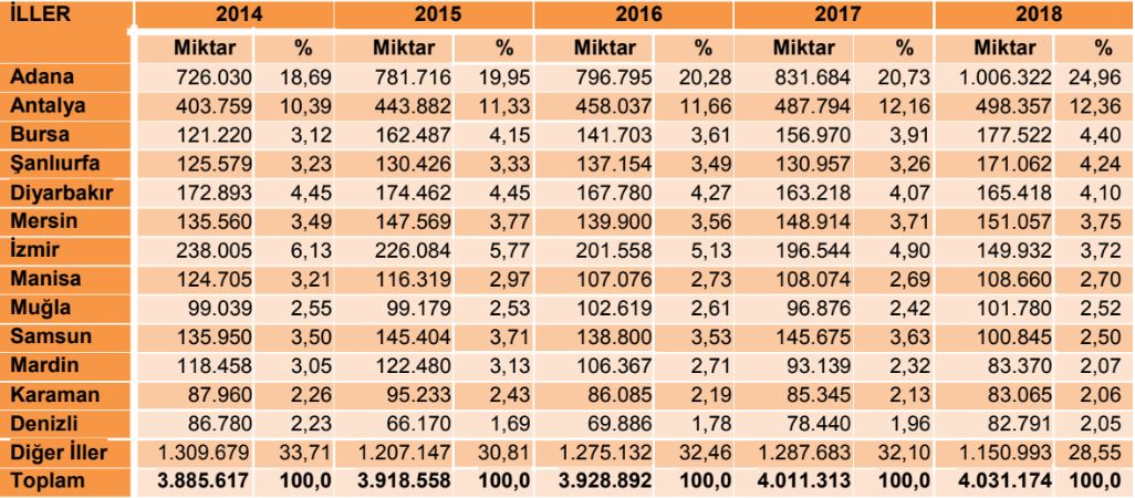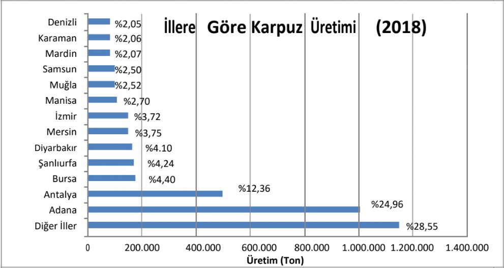 Türkiye’de yıllık 4 milyon ton karpuz üretimi yapılmaktadır. Kişi başı karpuz tüketimi 50 kg civarındadır. Karpuz üretiminin en fazla yapıldığı il Adana olup, 2018 yılında karpuz üretiminin yaklaşık %25’i bu ilimizden gerçekleştirilmiştir. Karpuz üretiminin önemli olduğu diğer ilimiz Antalya’da gerçekleşen üretim, Adana’daki üretimi yarısı kadardır.