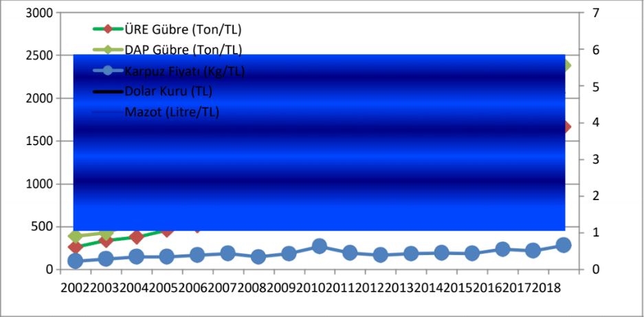 Karpuz fiyatları reel olarak düşerken,girdi fiyatlarına bakıldığında durumun tersi bir sonuçlakarşılaşılmaktadır. 2002 yılında 1 ton kg üre gübresi almak için 1.133 kg karpuz satılması gerekirken, 2018 yılında 1 ton kg üre gübresi almak için 2.521 kg karpuz satılması gerekmektedir. Aynı şekilde 1 ton kg DAP gübresi almak için 2002 yılında 1.693 kg karpuz satılması gerekirken, 2018 yılında 3.611 kg karpuz satılması gerekmektedir.