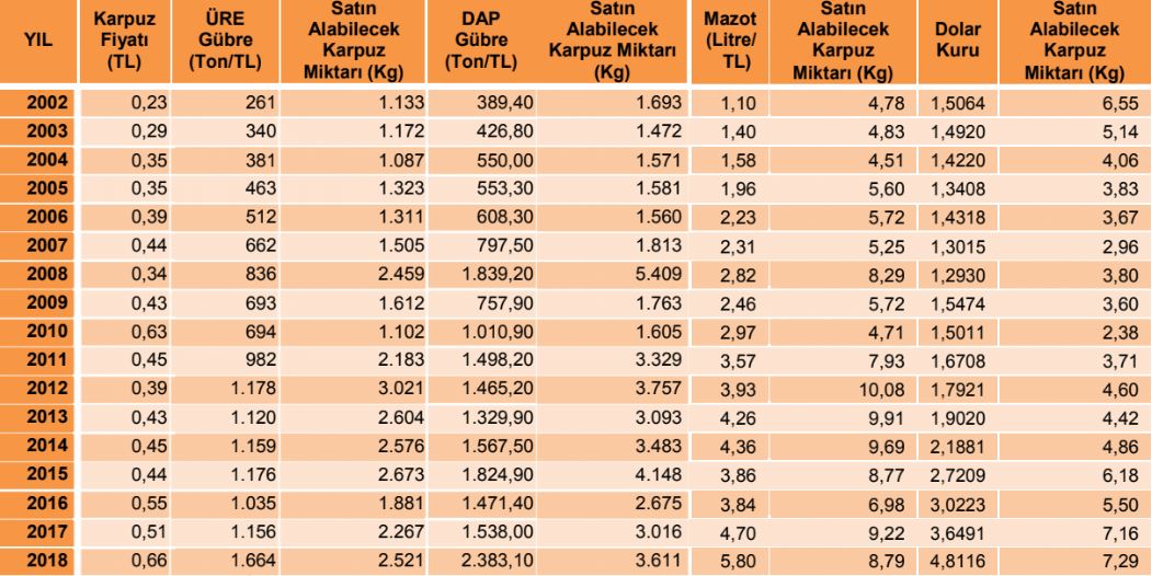 - 1 ton üre gübresi almak için 2002 yılında 1.133 kg karpuz satılması gerekirken, 2018 yılında 2.521 kg karpuz satılması gerekmektedir.