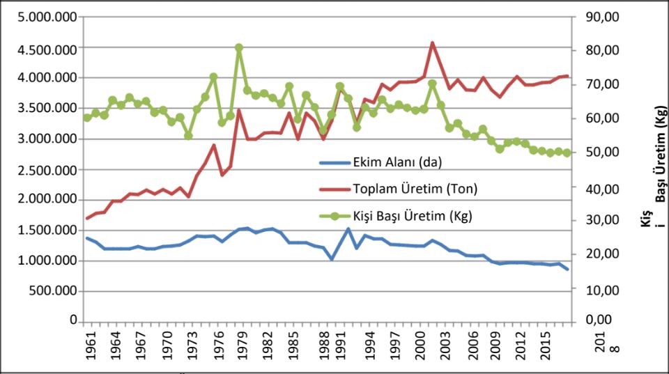1961 yılında 1.370 bin dekar alanda karpuz ekimi yapılırken, ekim alanı 2018 yılında 864 bin dekara düşmüştür. Aynı dönemde karpuz üretim miktarı 1.7 milyon tondan 4 milyon tona çıkmıştır. Ancak üretimdeki verimlilikten sağlanan bu artışa karşın, 1961 yılında 28 milyon olan nüfusun 2018 yılında 81 milyona çıkması nedeniyle kişi başı karpuz üretimi 60 kg’dan 50 kg’a düşmüştür.