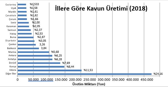 - 1961 yılında 1.13 milyon ton olan kavun üretimi 2018 yılında 1.75 milyon tona çıkmıştır.