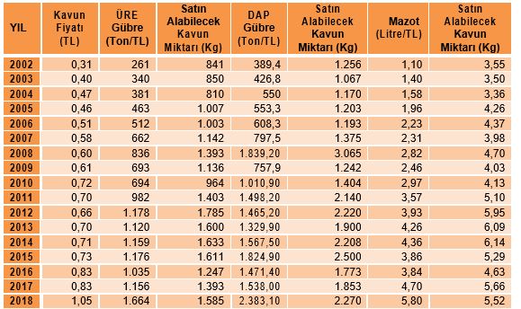 Mazot açısından bakıldığında da benzer bir durum görülmektedir. 1 litre mazot almak için 2002 yılında 3,55 kg kavun satılması gerekirken, 2018 yılında 5,52 kg kavun satılması gerekmektedir.