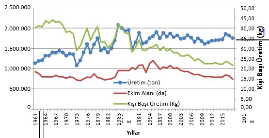 1961 yılında 920 bin dekar alanda kavun ekimi yapılırken, ekim alanı 2018 yılında 735 bin dekara düşmüştür. Aynı dönemde kavun üretim miktarı 1.13 milyon tondan 1.75 milyon tona çıkmıştır. Üretimdeki verimlilikten sağlanan bu artışa karşın, 1961 yılında 28 milyon olan nüfusun kişi başı kavun üretimi 40 kg iken, 2018 yılında 81 milyon olan nüfusun kişi başı kavun üretimi 22 kg’a düşmüştür.