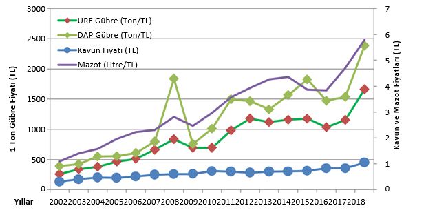 Kavun fiyatları reel olarak düşerken, girdi fiyatlarına bakıldığında durumun tersi bir sonuçla karşılaşılmaktadır. 2002 yılında 1 ton kg üre gübresi almak için 261 kg kavun satılması gerekirken, 2018 yılında 1 ton kg üre gübresi almak için 1.664 kg kavun satılması gerekmektedir. Aynı şekilde 1 ton kg DAP gübresi almak için 2002 yılında 1.256 kg kavun satılması gerekirken, 2018 yılında 2.270 kg kavun satılması gerekmektedir.
