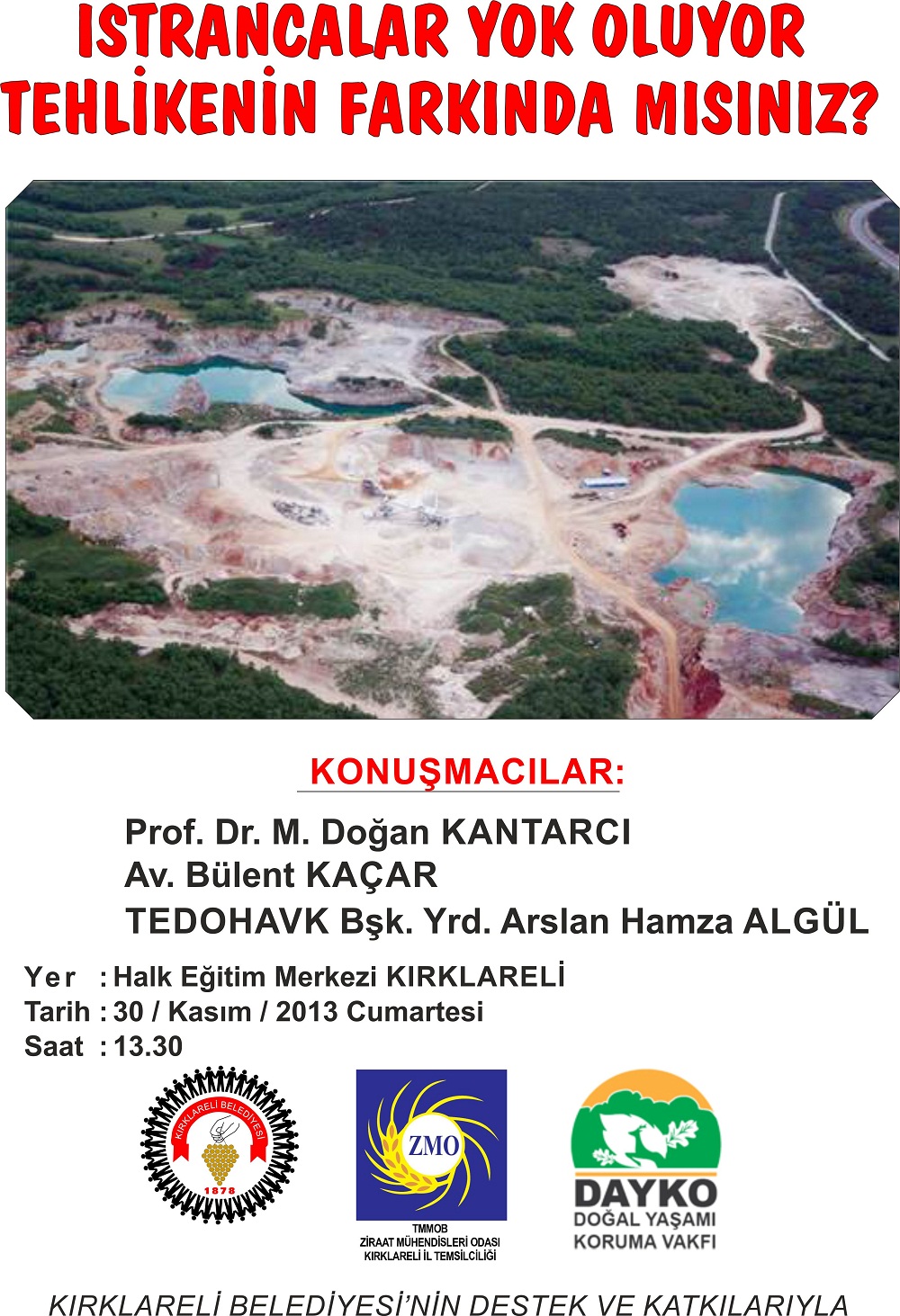 Istrancaların önemi, 1/100,000 ve 1/25,000 Çevre düzeni planları, vahşi madencilik ve son günlerde yörede yaşayanları endişeye sevk eden Dereköy Altın madeni, İçme ve sulama suyu havzalarımızda bulunan Armağan ve Kırklareli barajlarında yaşanan ve yaşanacak olan tehditler, bilim ve hukuk açısından değerlendirilecektir.