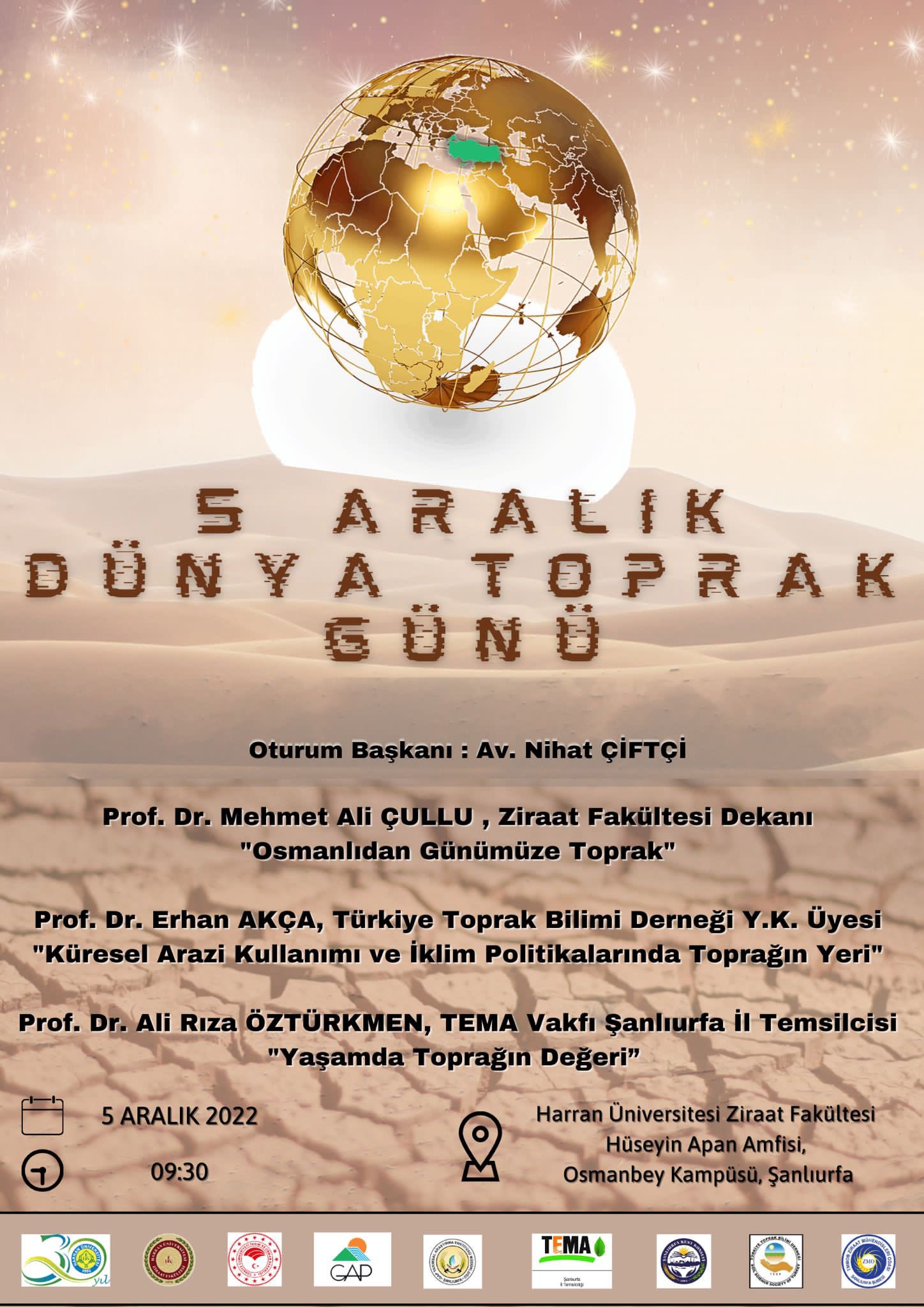 Şanlıurfa Şubemiz ile Harran Üniversitesi Ziraat Fakültesi, TEMA, Şanlıurfa İl Tarım ve Orman Müdürlüğü, GAP Tarımsal Araştırma Enstitüsü, Türkiye Toprak Bilimi Derneği, GAP ve Kent Konseyi tarafından ortaklaşa düzenlenen “5 Aralık Dünya Toprak Günü” etkinliği 5 Aralık 2022 Pazartesi günü Harran Üniversitesi Ziraat Fakültesi’nde gerçekleştirildi.