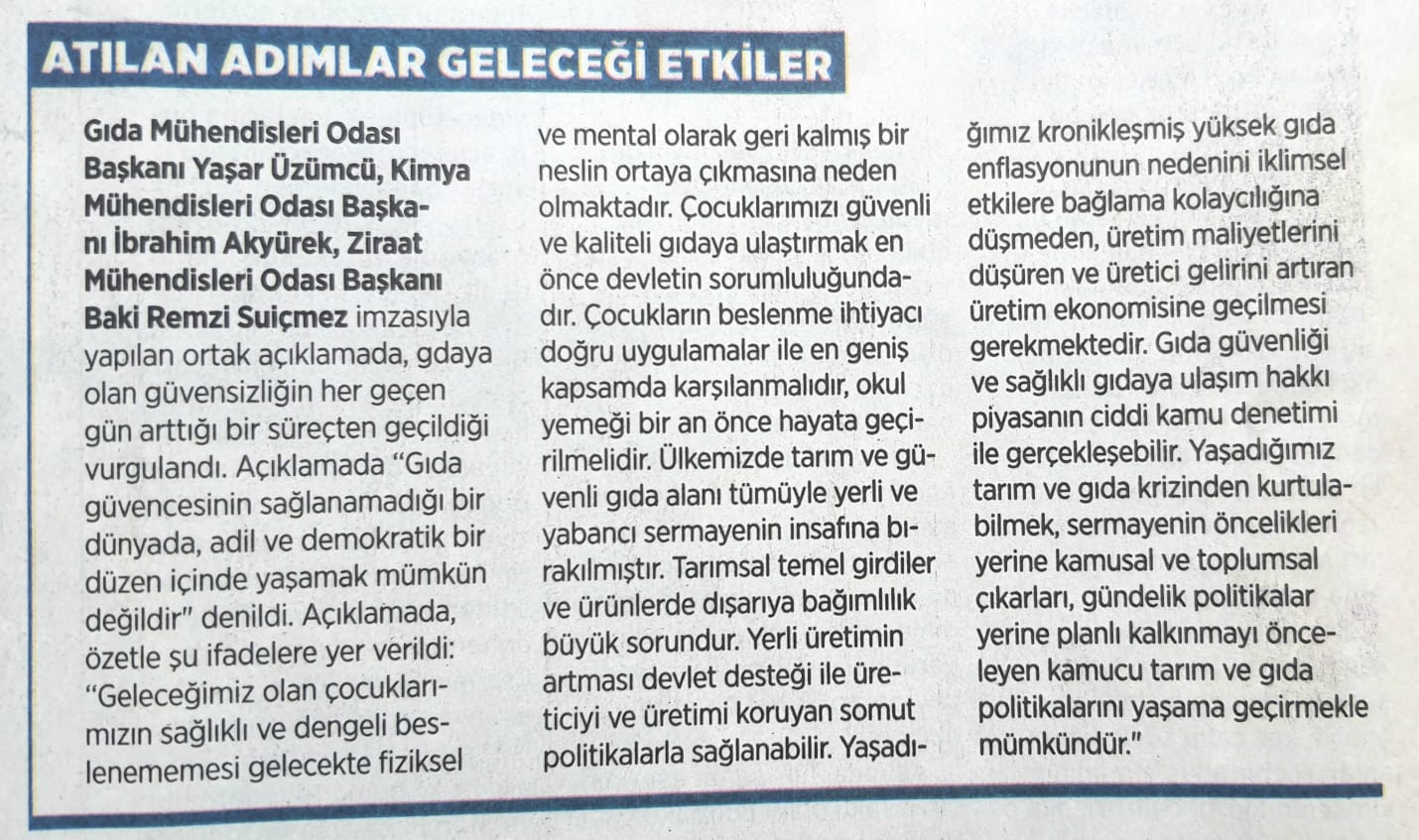 Gıda Mühendisleri Odası Başkanı Yaşar Üzümcü, Kimya Mühendisleri Odası Başkanı İbrahim Akyürek, Ziraat Mühendisleri Odası Başkanı Baki Remzi Suiçmez imzasıyla yapılan ortak açıklamada, gdaya olan güvensizliğin her geçen gün arttığı bir süreçten geçildiği vurgulandı. Açıklamada ‘‘Gıda güvencesinin sağlanamadığı bir dünyada, adil ve demokratik bir düzen içinde yaşamak mümkün değildir" denildi. Açıklamada, özetle şu ifadelere yer verildi: ‘‘Geleceğimiz olan çocuklarımızın sağlıklı ve dengeli beslenememesi gelecekte fiziksel ve mental olarak geri kalmış bir neslin ortaya çıkmasına neden olmaktadır. Çocuklarımızı güvenli ve kaliteli gıdaya ulaştırmak en önce devletin sorumluluğundadır. Çocukların beslenme ihtiyacı doğru uygulamalar ile en geniş kapsamda karşılanmalıdır, okul yemeği bir an önce hayata geçirilmelidir. Ülkemizde tarım ve güvenli gıda alanı tümüyle yerli ve yabancı sermayenin insafına bırakılmıştır. Tarımsal temel girdiler ve ürünlerde dışarıya bağımlılık büyük sorundur. Yerli üretimin artması devlet desteği ile üreticiyi ve üretimi koruyan somut politikalarla sağlanabilir. Yaşadığımız kronikleşmiş yüksek gıda enflasyonunun nedenini iklimsel etkilere bağlama kolaycılığına düşmeden, üretim maliyetlerini düşüren ve üretici gelirini artıran üretim ekonomisine geçilmesi gerekmektedir. Gıda güvenliği ve sağlıklı gıdaya ulaşım hakkı piyasanın ciddi kamu denetimi ile gerçekleşebilir. Yaşadığımız tarım ve gıda krizinden kurtulabilmek, sermayenin öncelikleri yerine kamusal ve toplumsal çıkarları, gündelik politikalar yerine planlı kalkınmayı önceleyen kamucu tarım ve gıda politikalarını yaşama geçirmekle mümkündür."