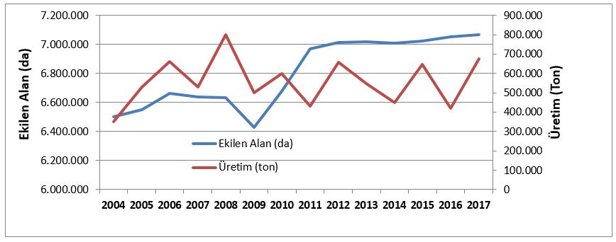Grafik-1 Fındık Üretimi ve Üretim Yapılan Alanlar