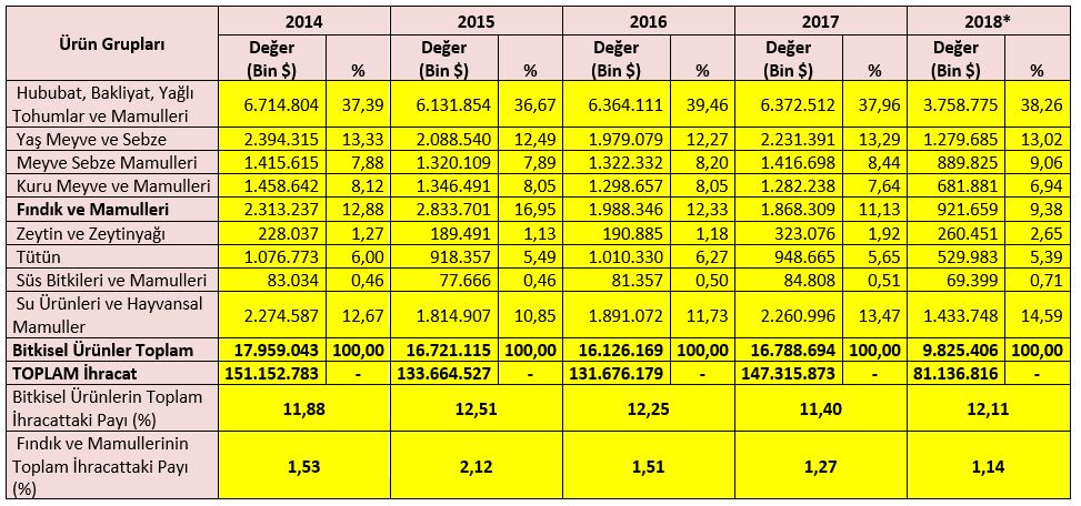 Fındık, bitkisel ürün ihracatımız içinde önemli bir paya sahiptir. İhracat değeri olarak Hububat, Bakliyat, Yağlı Tohumlar ve Mamulleri ile Yaş Meyve ve Sebze grubundan sonra yaklaşık %12’lik payla üçüncü sırada gelmektedir.