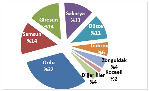 Fındık üretiminin en fazla yapıldığı il Ordu’dur. Fındık üretiminin %85’i Ordu, Samsun, Giresun, Sakarya ve Düzce’den gerçekleştirilmektedir.