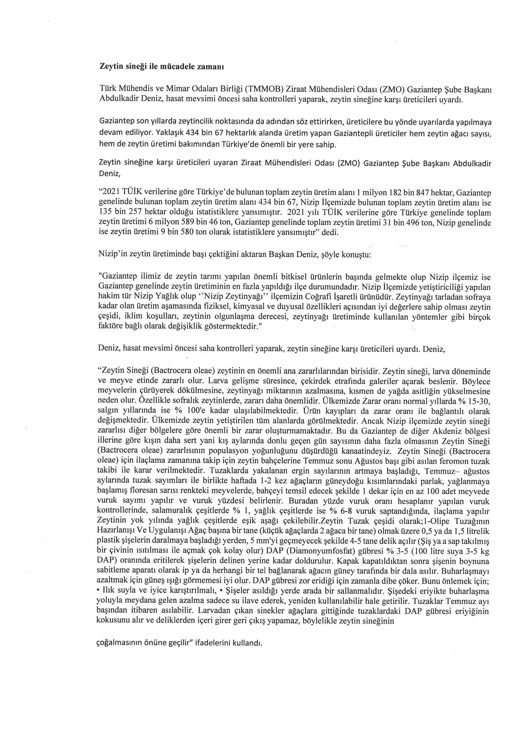 Türk Mühendis ve Mimar Odaları Birliği (TMMOB) Ziraat Mühendisleri Odası (ZMO) Gaziantep Şube Başkanı Abdulkadir Deniz, hasat mevsimi öncesi saha kontrolleri yaparak, zeytin sineğine karşı üreticileri uyardı.