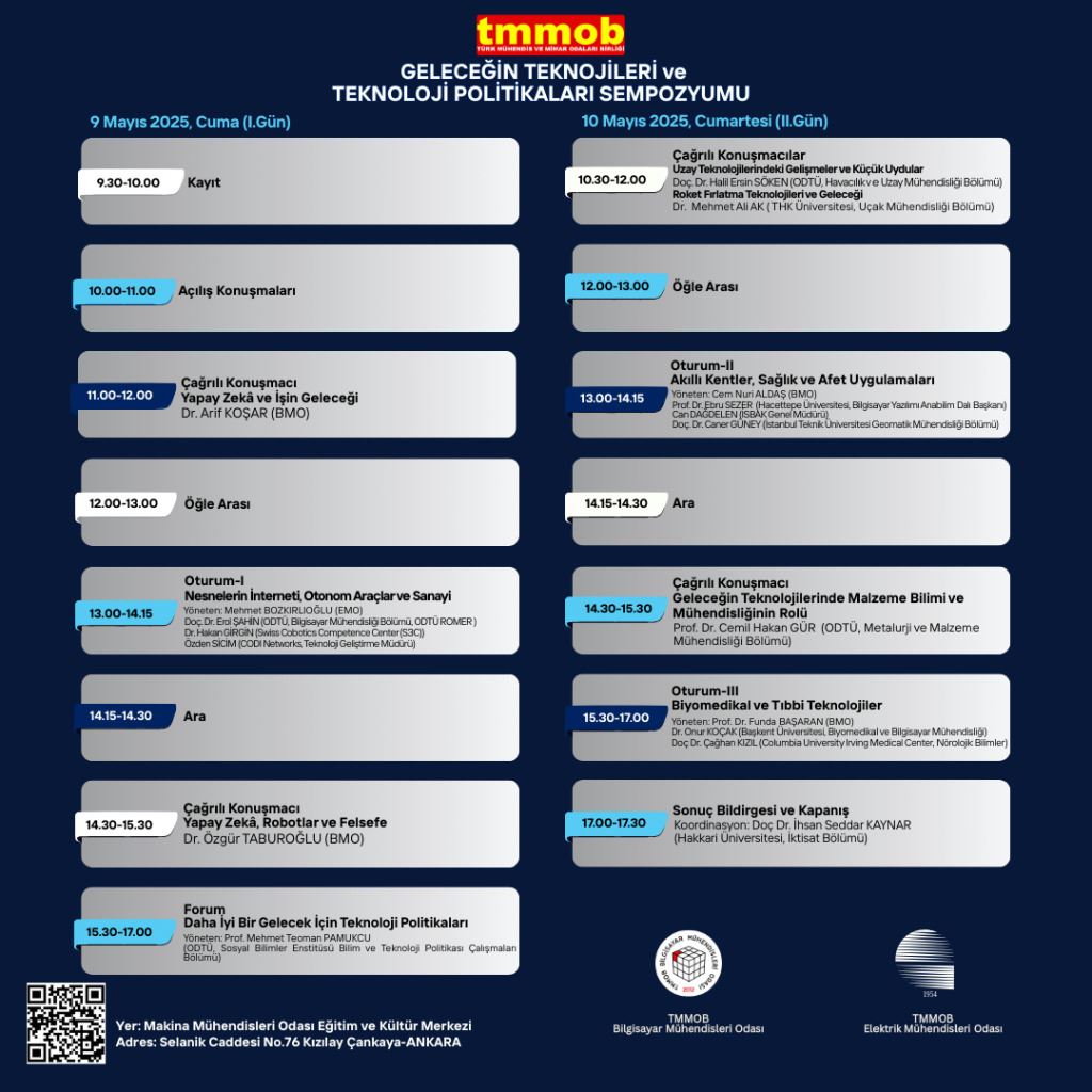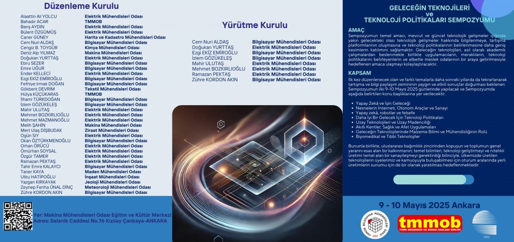 TMMOB adına Bilgisayar Mühendisleri Odası (BMO) ve Elektrik Mühendisleri Odasının (EMO) yürütücülüğünde, önümüzdeki dönemlerde de devam etmesi planlanan ve ilki 9-10 Mayıs 2025 günlerinde gerçekleştirilecek “Geleceğin Teknolojileri ve Teknoloji Politikaları” konulu bir sempozyum düzenlenmektedir.