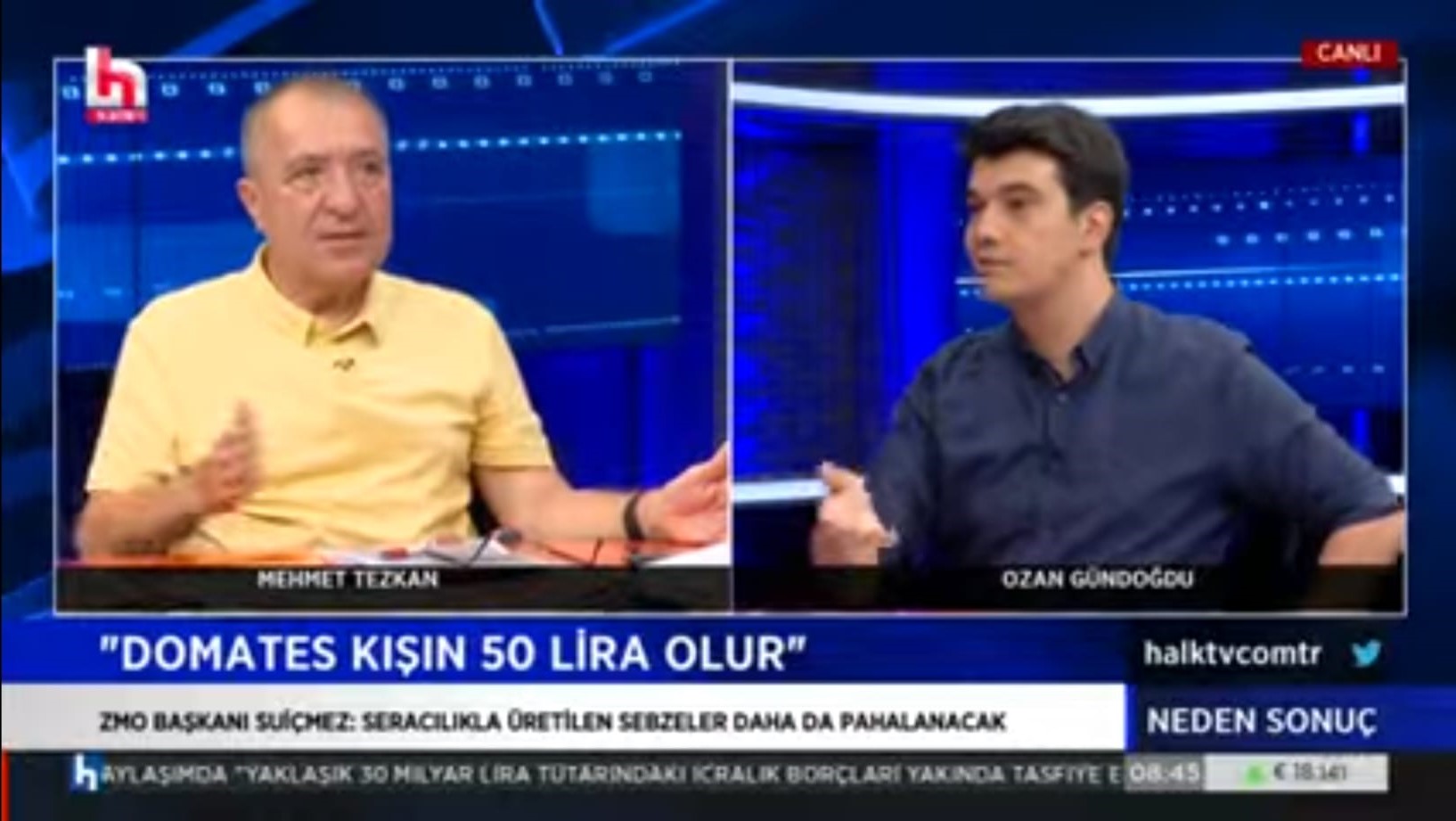 ODA Başkanımız Baki Remzi SUİÇMEZ’in “domates fiyatı özelinden ürün fiyatlarının kış aylarında da düşmeyeceği” yönündeki açıklamaları Halk TV’de Mehmet TEZKAN ve Oğuz GÜNDOĞDU tarafından sunulan "Neden Sonuç" programında 26 Ağustos 2022 Cuma günü saat 08.30’da yayınlandı.