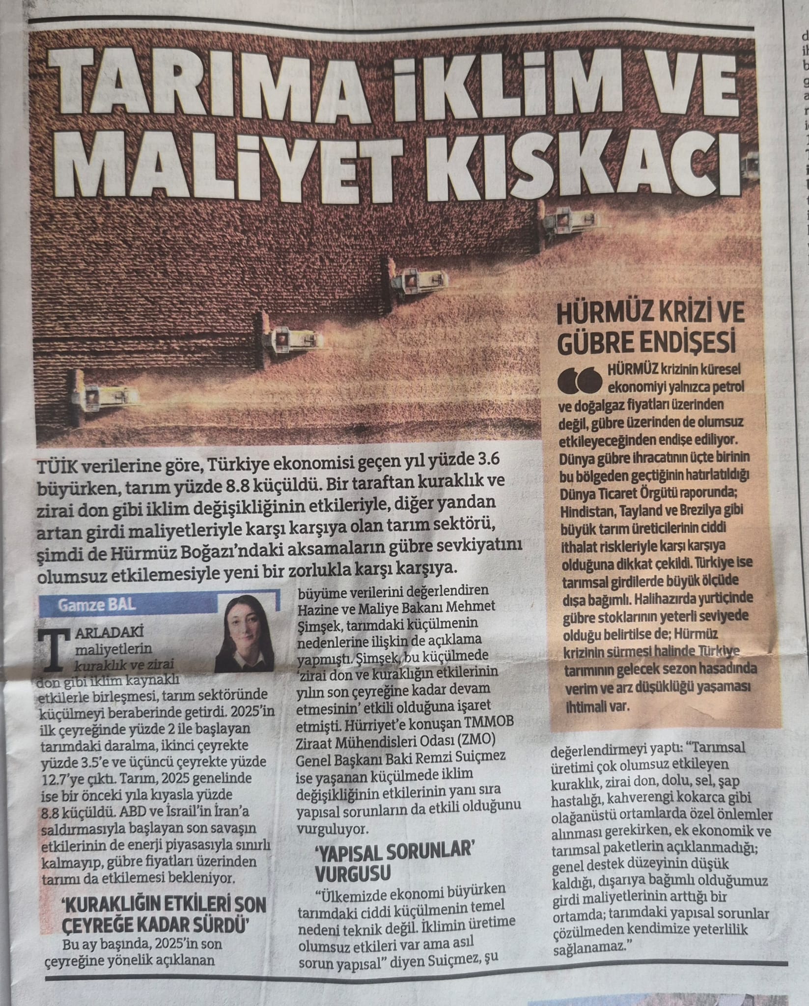 TÜİK verilerine göre, Türkiye ekonomisi geçen yıl yüzde 3.6 büyürken, tarım yüzde 8.8 küçüldü. Bir taraftan kuraklık ve zirai don gibi iklim değişikliğinin etkileriyle, diğer yandan artan girdi maliyetleriyle karşı karşıya olan tarım sektörü, şimdi de Hürmüz Boğazı’ndaki aksamaların gübre sevkiyatını olumsuz etkilemesiyle yeni bir zorlukla karşı karşıya.