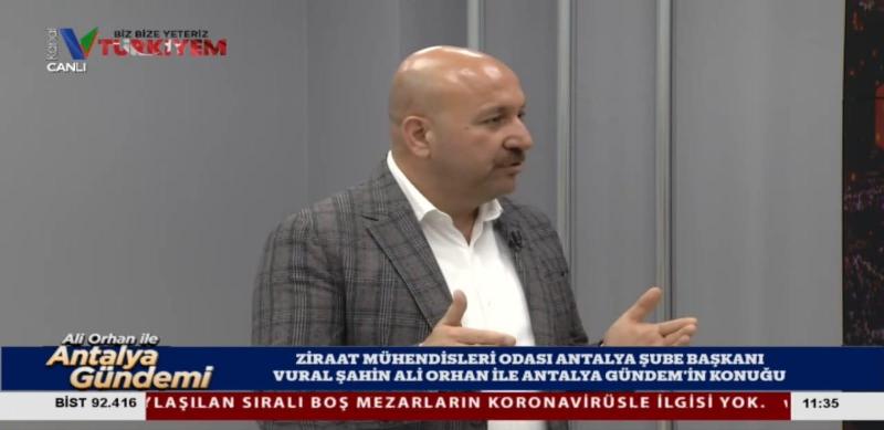 Şube Başkanımız Vural Şahin, 08 Nisan 2020 tarihinde Kanal V` de canlı yayınlanan " Ali Orhan İle Antalya Gündemi" programına katıldı. Programda Covid19 salgını tedbirleri kapsamında, Antalya ve Türkiye tarımını değerlendirdi.