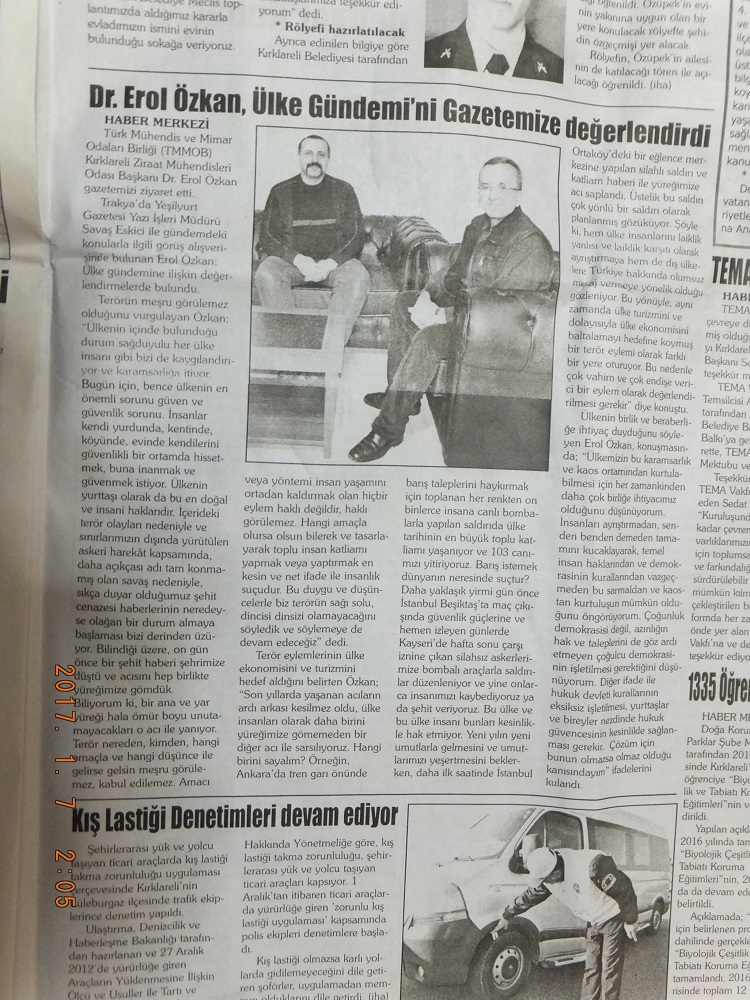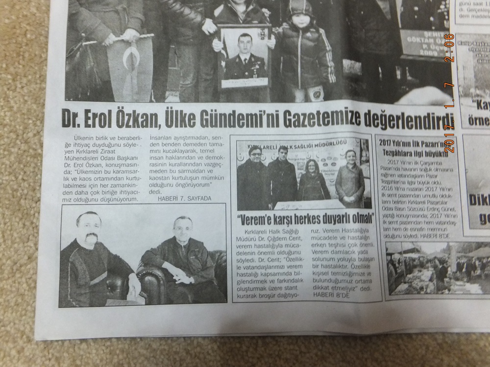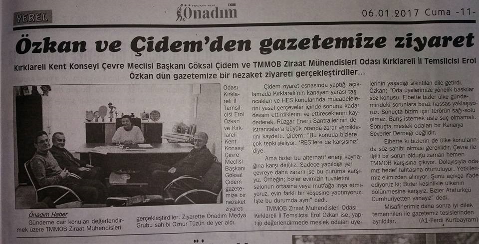 Kırklareli İl Temsilcimiz Dr. Erol ÖZKAN, il merkezindeki bazı yerel basın kuruluşlarını 04 Ocak 2017 Çarşamba ve 05 Ocak 2017 Perşembe günleri ziyaret ederek, çeşitli görüşmelerde bulundu ve gündeme ilişkin bazı konularda görüş ve düşüncelerini aktardı.