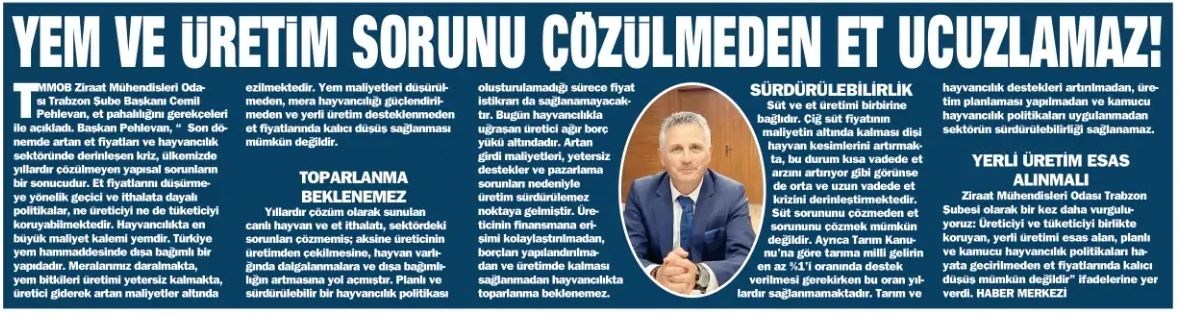 Hayvancılıkta en büyük maliyet kalemi yemdir. Türkiye yem hammaddesinde dışa bağımlı bir yapıdadır. Meralarımız daralmakta, yem bitkileri üretimi yetersiz kalmakta, üretici giderek artan maliyetler altında ezilmektedir. Yem maliyetleri düşürülmeden, mera hayvancılığı güçlendirilmeden ve yerli üretim desteklenmeden et fiyatlarında kalıcı düşüş sağlanması mümkün değildir.