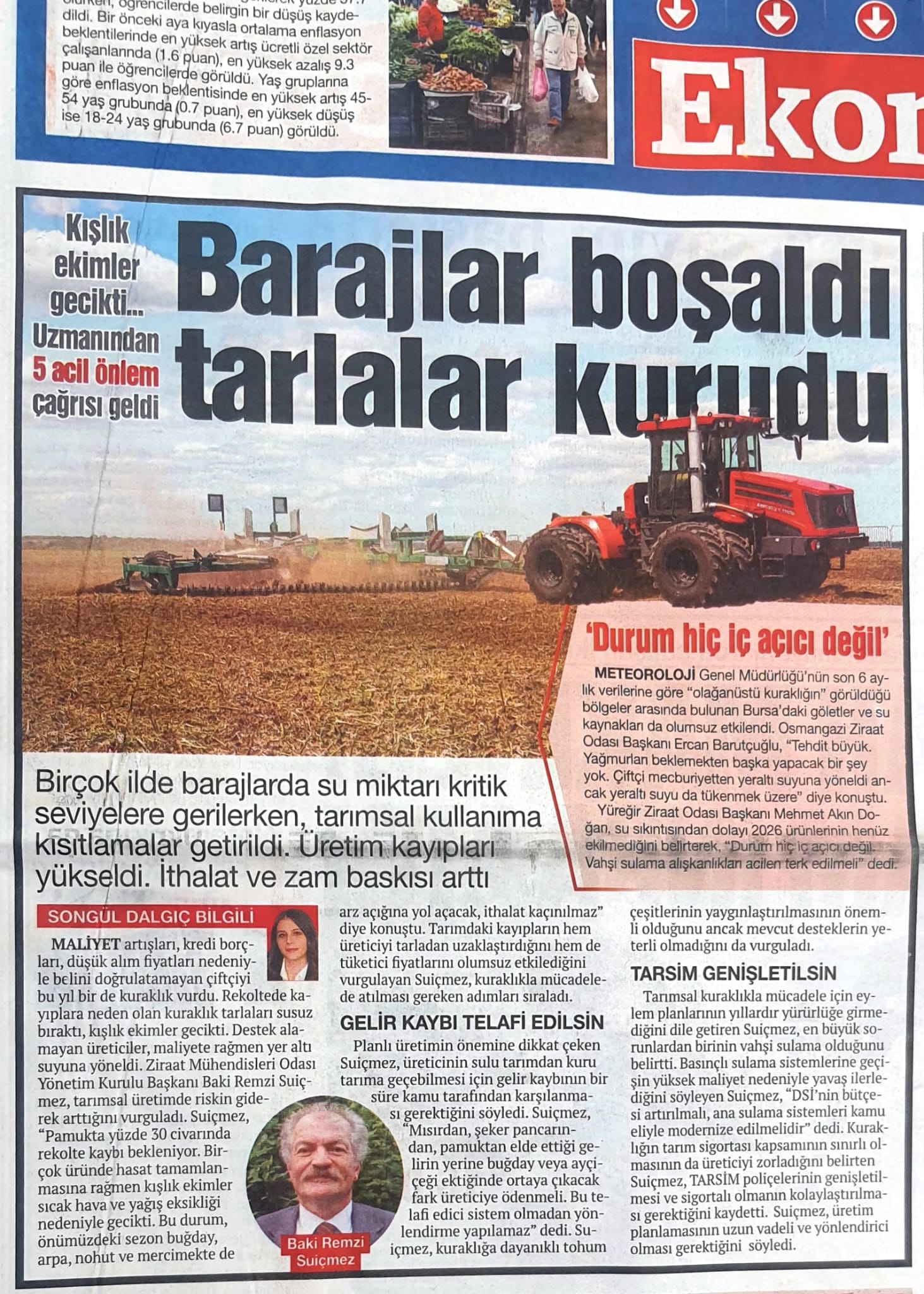 Maliyet artışları, kredi borçları, düşük alım fiyatları nedeniyle belini doğrulatamayan çiftçiyi bu yıl bir de kuraklık vurdu. Rekoltede kayıplara neden olan kuraklık tarlaları susuz bıraktı, kışlık ekimler gecikti. Destek alamayan üreticiler, maliyete rağmen yer altı suyuna yöneldi. Ziraat Mühendisleri Odası Yönetim Kurulu Başkanı Baki Remzi Suiçmez, tarımsal üretimde riskin giderek arttığını vurguladı. Suiçmez, “Pamukta yüzde 30 civarında rekolte kaybı bekleniyor. Birçok üründe hasat tamamlanmasına rağmen kışlık ekimler sıcak hava ve yağış eksikliği nedeniyle gecikti. Bu durum, önümüzdeki sezon buğday, arpa, nohut ve mercimekte de arz açığına yol açacak, ithalat kaçınılmaz” diye konuştu. Tarımdaki kayıpların hem üreticiyi tarladan uzaklaştırdığını hem de tüketici fiyatlarını olumsuz etkilediğini vurgulayan Suiçmez, kuraklıkla mücadelede atılması gereken adımları sıraladı.