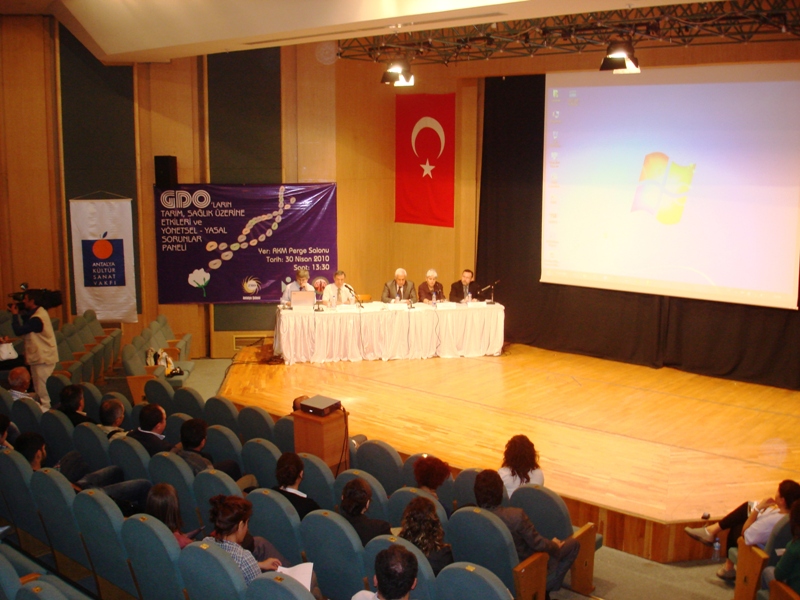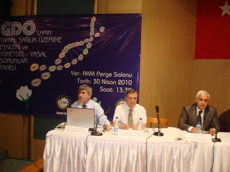 Antalya Şubemiz, Antalya Barosu ve YAYED tarafından düzenlenen GDO paneli 30 Nisan 2010 tarihinde AKM Perge Salonunda yapıldı. Şube Başkanımız Vahap TUNCER‘in oturum başkanlığı yaptığı panelde Prof. Dr. Tayfun ÖZKAYA "GDO‘lar Tarım ve Tarım Politikalarına Etkileri", Prof. Dr. Ali Osman KARABABA "GDO‘ların Sağlık Üzerine Etkileri", Prof. Dr. Gürsel ÖZTUNALI KAYIR "GDO‘lar ve Yerel Yönetimler", Avukat Tuncay KOÇ "Etik, Hukuk ve GDO‘lar" başlıklı sunumlarını yaptılar.