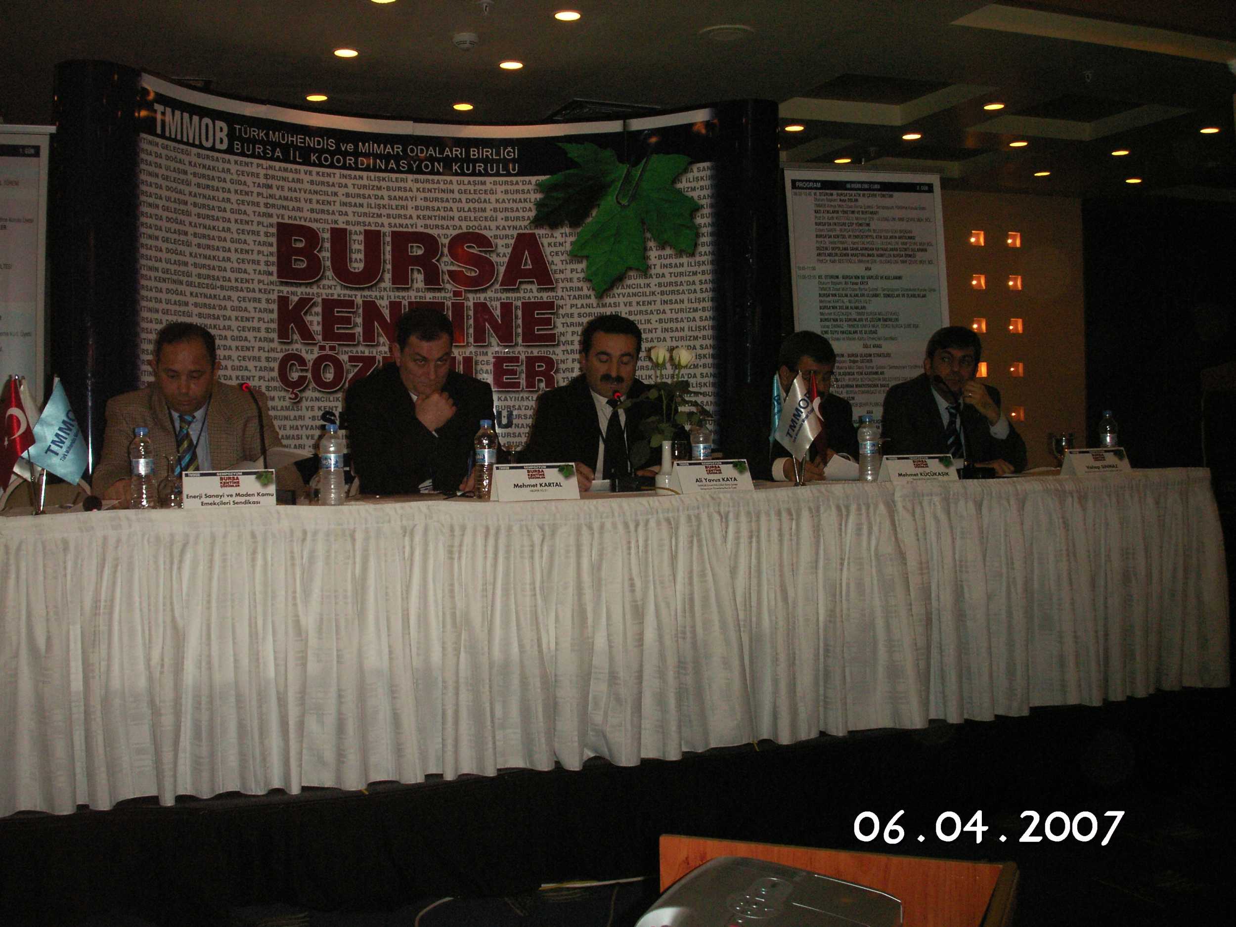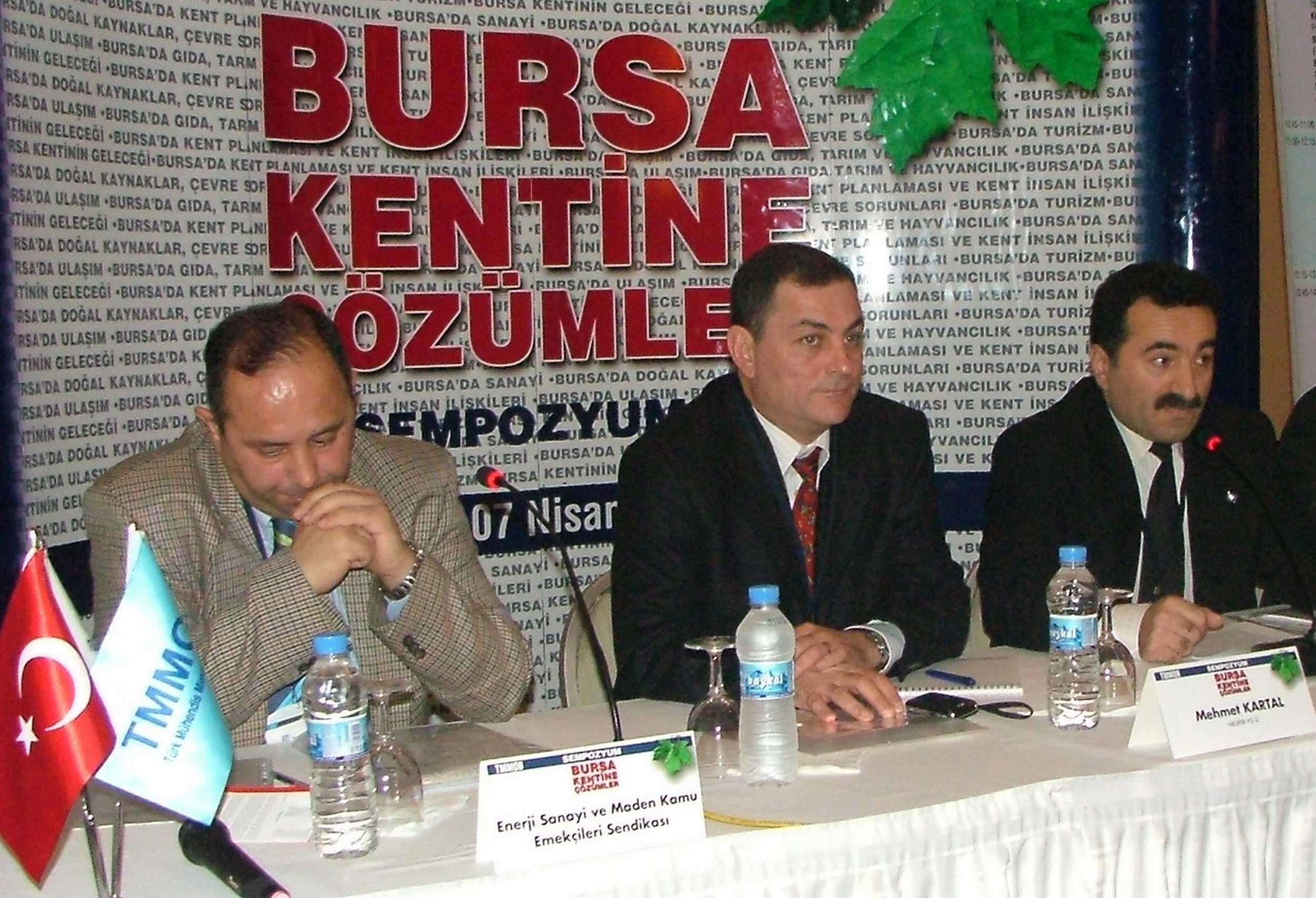 TMMOB İl Koordinasyon Kurulu‘nca düzenlenen Bursa Kentine Çözümler Sempozyumu‘nun "Bursa‘nın Su Varlığı ve Kullanımı" başlıklı oturumu, TMMOB Ziraat Mühendisleri Odası Bursa Şube üyesi Ali Yavuz KAYA Başkanlığında gerçekleştirildi. Bursa‘nın sulak alanları, Uluabat‘a ilişkin olasılıklar ve sonuçlar, su sorunları ve çözüm önerileri, içme suyu havzaları ve Uludağ‘ın ele alındığı oturumda, küresel ısınmanın kuraklığa etkisi ve sulara sahip çıkılması gerekliliği de vurgulandı. Oturuma konuşmacı olarak Nilüfer Yerel Gündem 21‘den Mehmet KARTAL, CHP Bursa Milletvekili Mehmet KÜÇÜKAŞIK, TMMOB Kimya Mühendisleri Odası Bursa Şube Başkanı Vahap SINMAZ ile Enerji Sanayi ve Maden Kamu Emekçileri Sendikası temsilcisi katıldı.