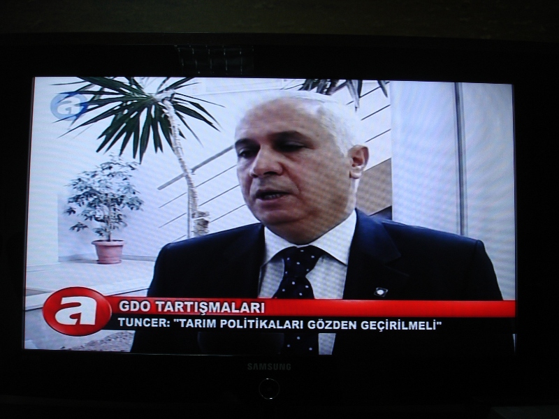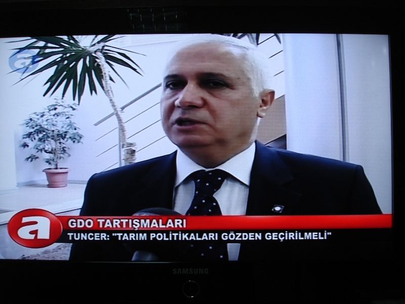 05.11.2009 Tarihinde Akdeniz Tv nin ana haber bültenine bağlanarak GDO‘lu ürünler ile ilgili açıklamalarda bulunan Şube Başkanımız Vahap TUNCER konuşmasında şöyle dedi; Son birkaç gündür ulusal basında GDO‘yla çıkan tüm haberlerde sebze meyve görüntülerinin kullanılmasına adeta isyan ettiğini , bu tür yanlış haberlerin tarım kenti Antalya‘ya zarar verdiğini belirterek ‘‘GDO‘lu ürünler pazardan çok market raflarında bulunuyor‘‘ dedi. |
