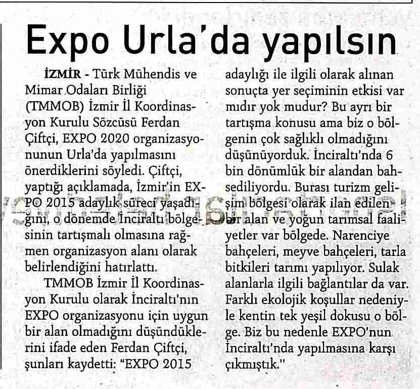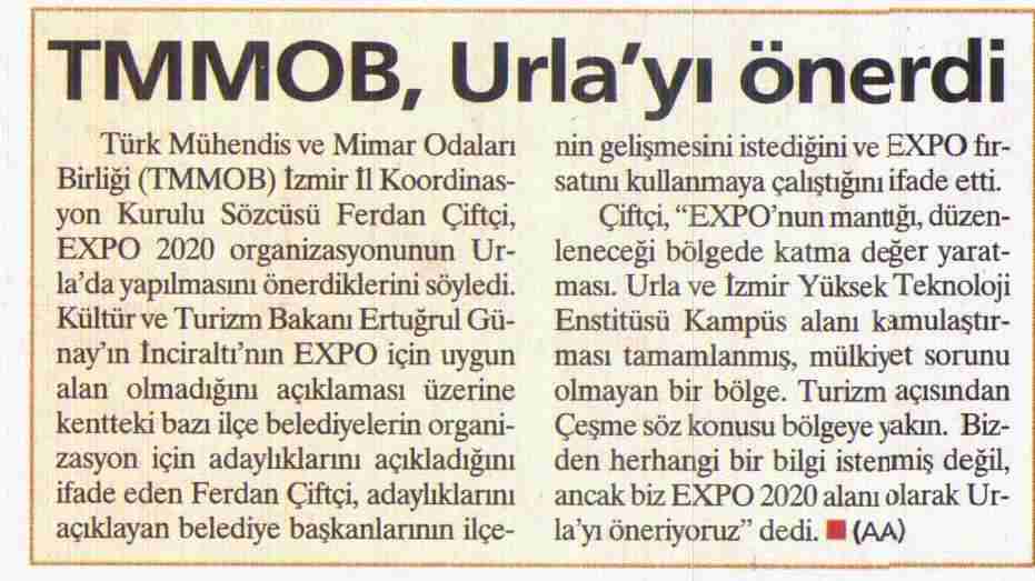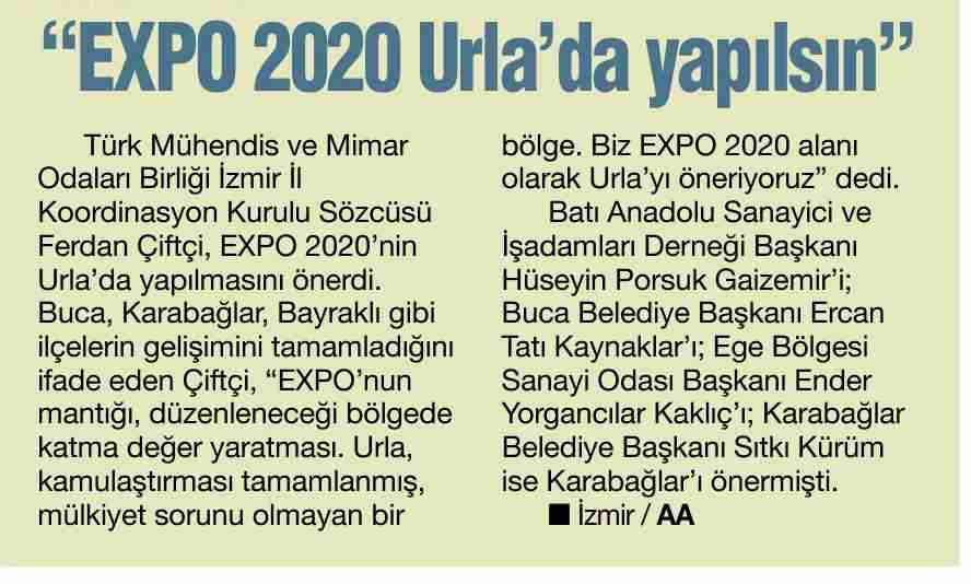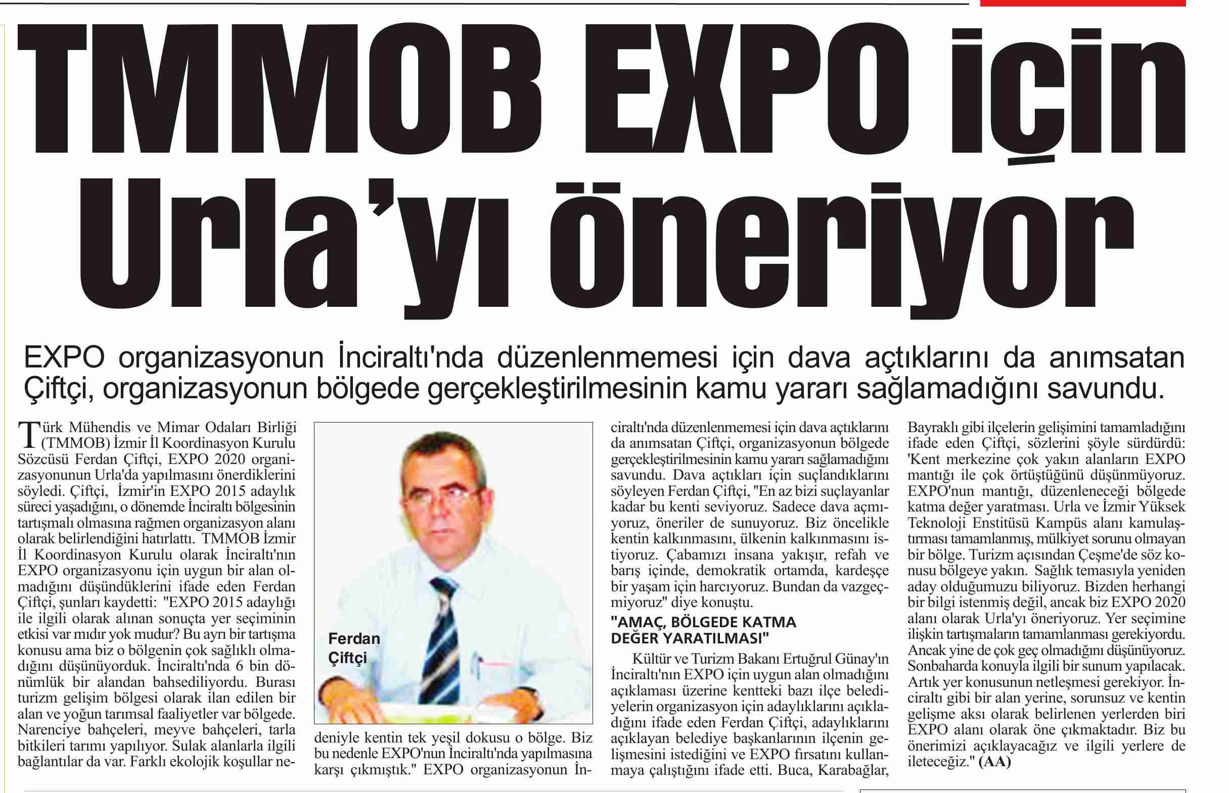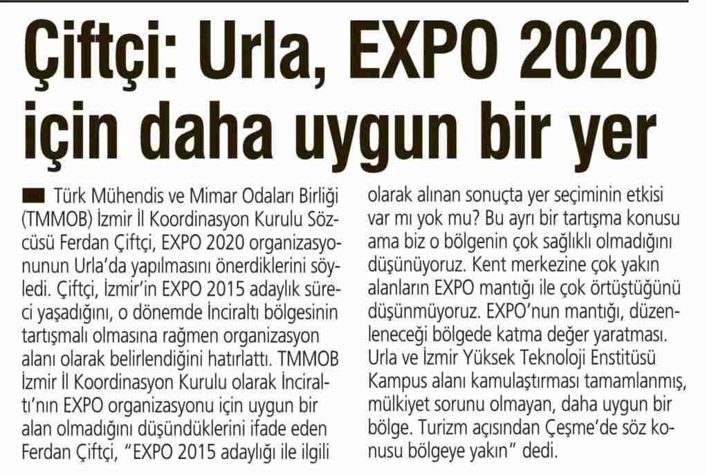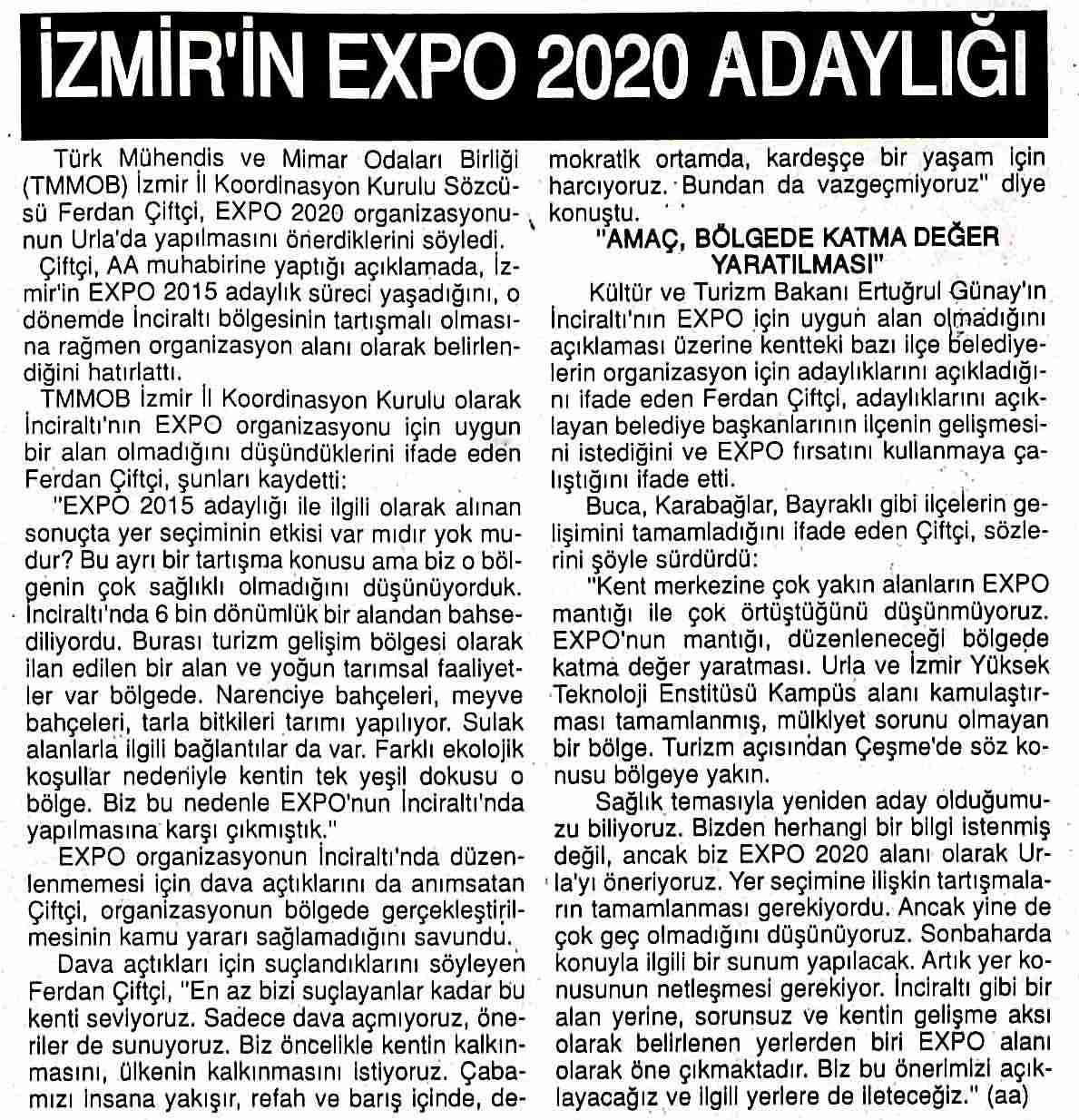 Şube Başkanımız TMMOB İzmir İl Koordinasyon Kurulu Sekreteri Ferdan ÇİFTÇİ Anadolu Ajansı‘na İzmir‘in Expo 2020 adaylığı ve yer seçimi konusunda açıklama yaptı. Açıklama ulusal ve yerel basında ( Sabah, Yeni Asır, Milliyet, Yenigün, Son saat, Ticaret gazetesi, Zaman, Habertürk, Özgür Gündem, Yeni Gazetem Ege, Ege‘de Bugün) yer aldı.