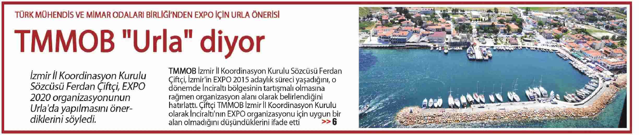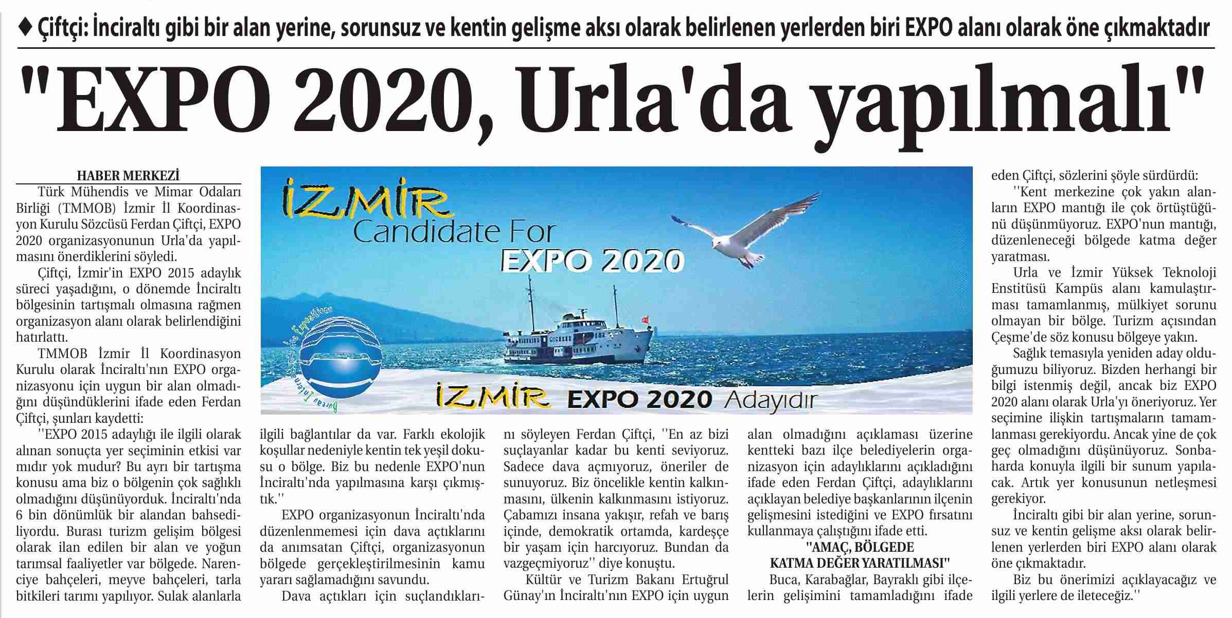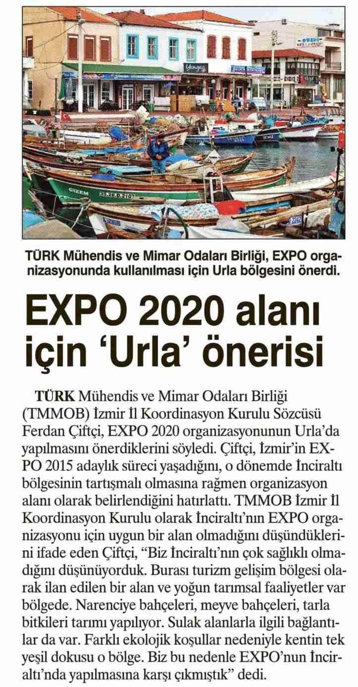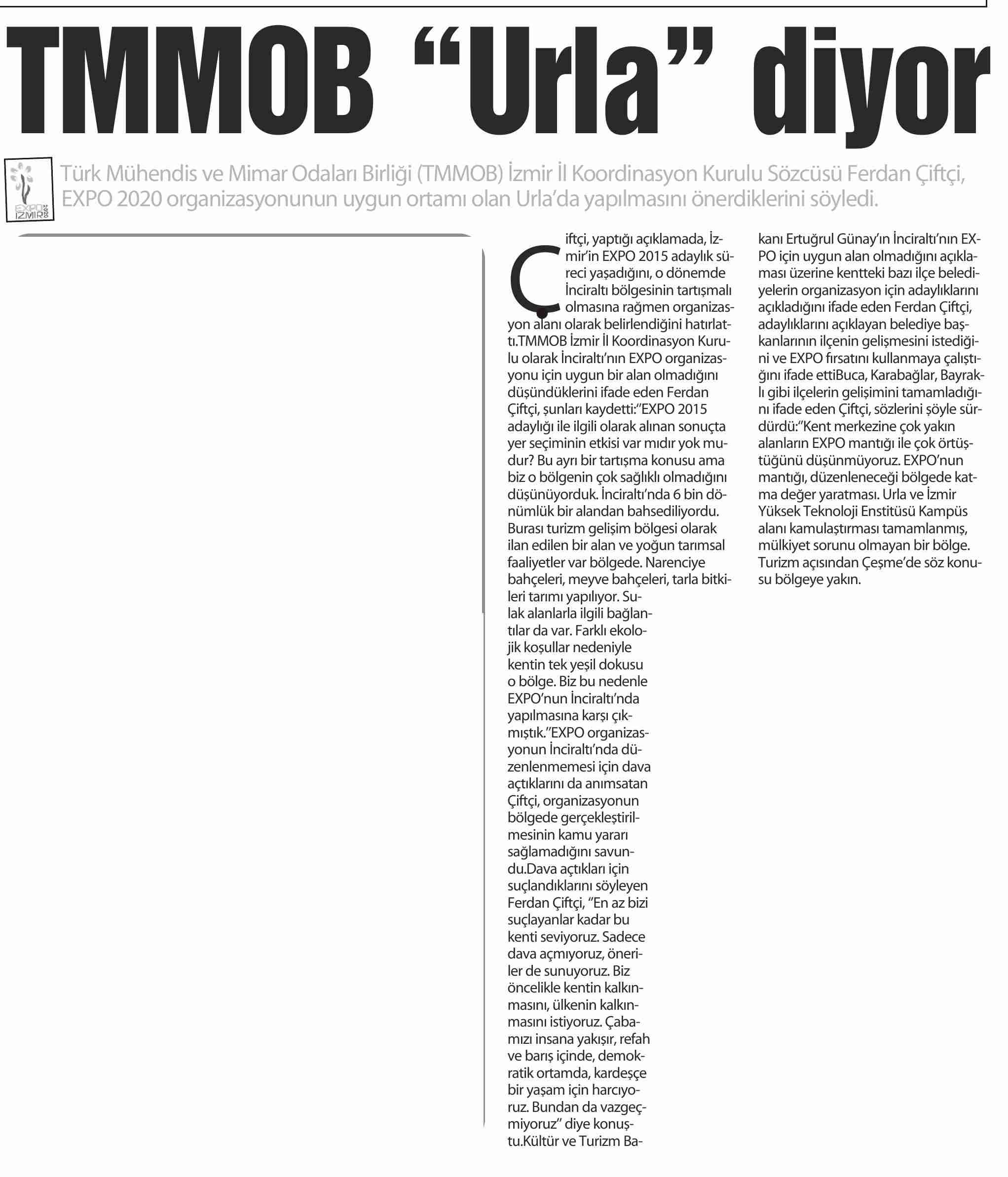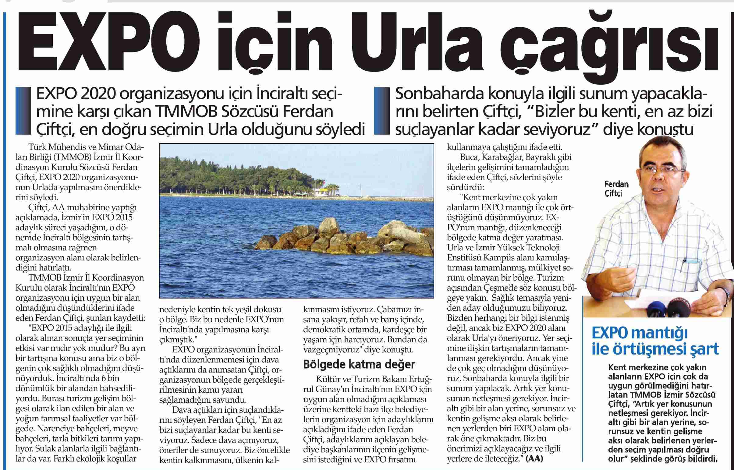 Şube Başkanımız TMMOB İzmir İl Koordinasyon Kurulu Sekreteri Ferdan ÇİFTÇİ Anadolu Ajansı‘na İzmir‘in Expo 2020 adaylığı ve yer seçimi konusunda açıklama yaptı. Açıklama ulusal ve yerel basında ( Sabah, Yeni Asır, Milliyet, Yenigün, Son saat, Ticaret gazetesi, Zaman, Habertürk, Özgür Gündem, Yeni Gazetem Ege, Ege‘de Bugün) yer aldı.
