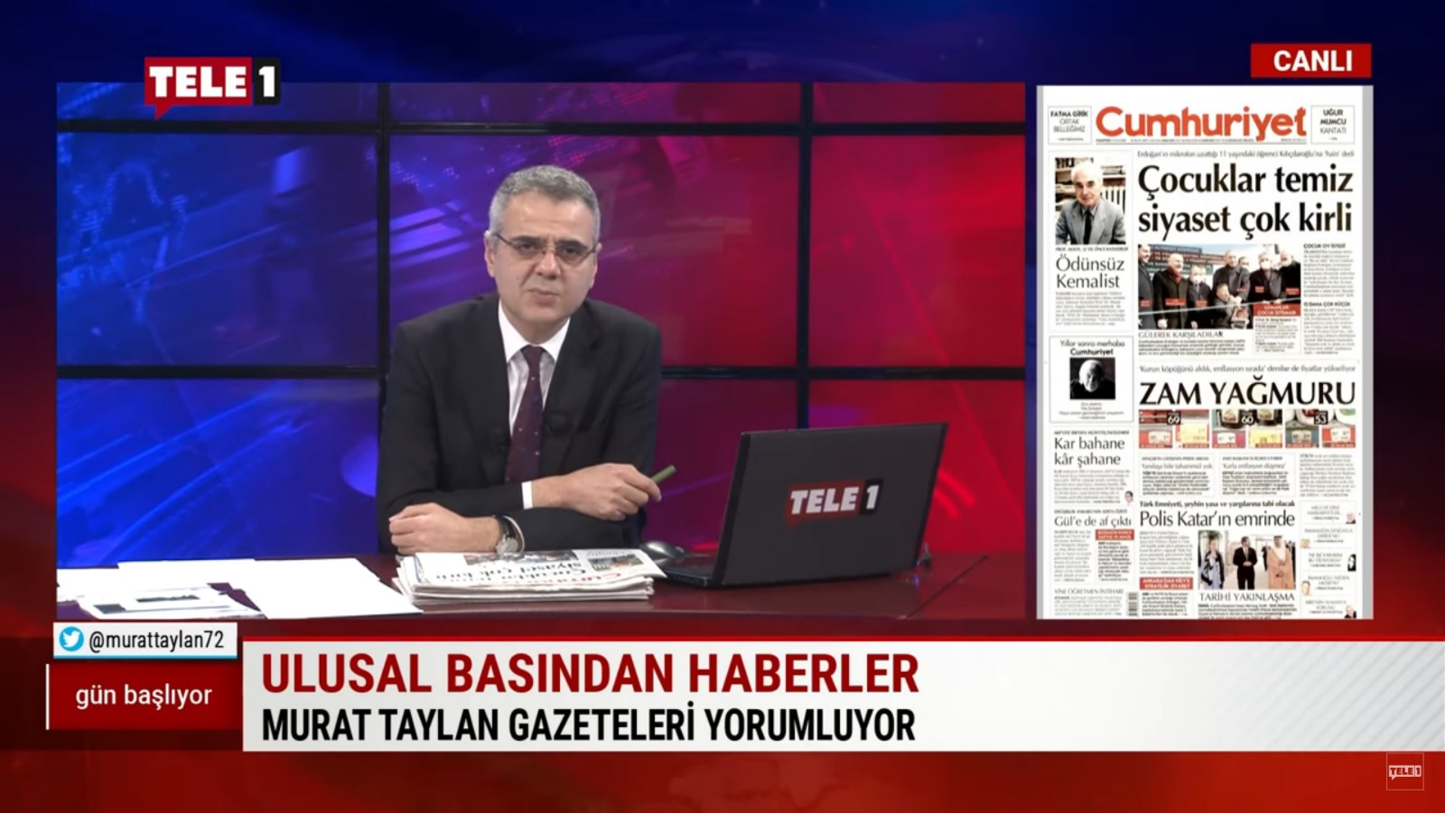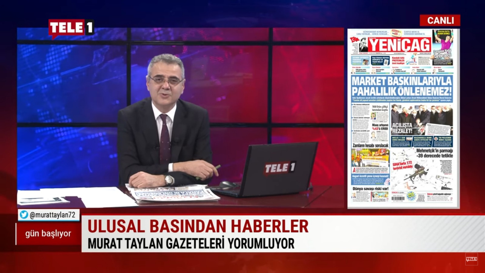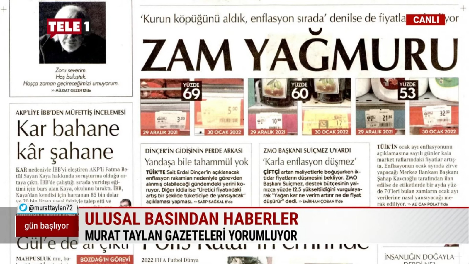 TELE1 ekranlarında Murat TAYLAN tarafından sunulan “Gün Başlıyor” adlı programın 31 Ocak 2022 Pazartesi günü saat 08.40’ta yayınlanan bölümünde, ODA Başkanımız Baki Remzi SUİÇMEZ’in YeniÇağ gazetesinde manşetten yayımlanan “Market Baskınlarıyla Pahalılık Önlenemez!” açıklamasına ve Cumhuriyet gazetesinde manşetten yayımlanan "Zam Yağmuru" açıklamasına yer verildi.